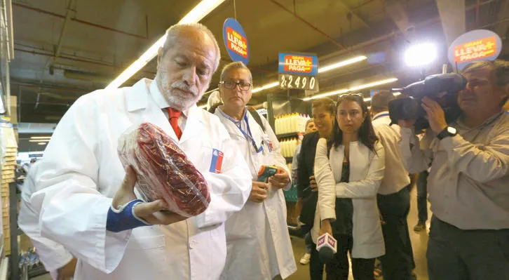 عضو من السلطات الصحية يستعرض قطعة لحم مشبوهة في متجر بتشيلي أمس (رويترز)