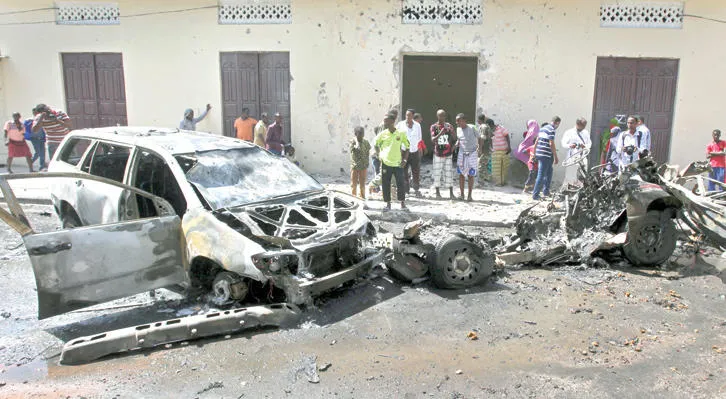 صوماليون يتجمعون بالقرب من السيارة المفخخة التي انفجرت في مقديشو أمس (أ. ب)