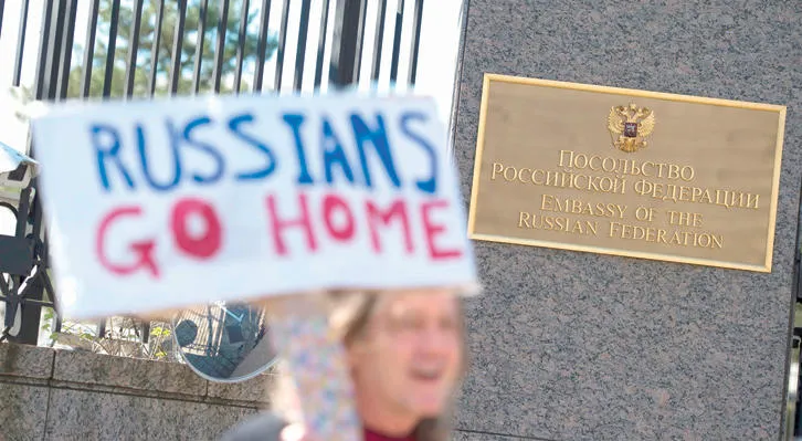 محتجون أمام السفارة الروسية في واشنطن يرفعون لافتات تخاطب موظفيها تقول «ارجعوا إلى بلدكم» (أ.ف.ب)
