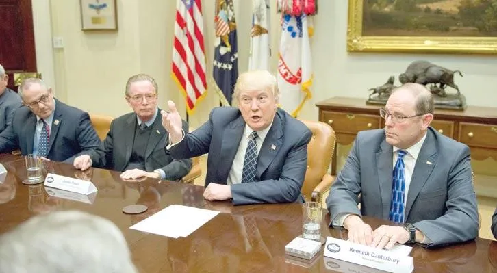 الرئيس الأميركي يخاطب وفداً من أجهزة الشرطة في البيت الأبيض أمس (إ.ب.أ)