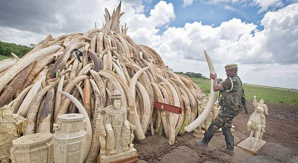 جندي كيني يرتب كمية من العاج المصادرة قبل حرقها في حديقة نيروبي الوطنية (أ.ب)