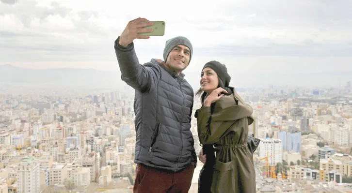 مواطنان إيرانيان يلتقطان «سيلفي» في آخر أيام عطلة النيروز (رأس السنة الإيرانية) (سيزده بدر) في منطقة شمال طهران (أ.ب)