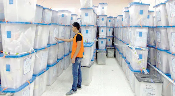 موظف لدى المفوضية العليا للانتخابات يفحص الأرقام على صناديق الاقتراع في مركز انتخابي ببغداد أمس (رويترز)