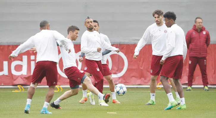 لاعبو بايرن ميونيخ خلال التدريبات أمس استعداداً لمواجهة الريـال (رويترز)