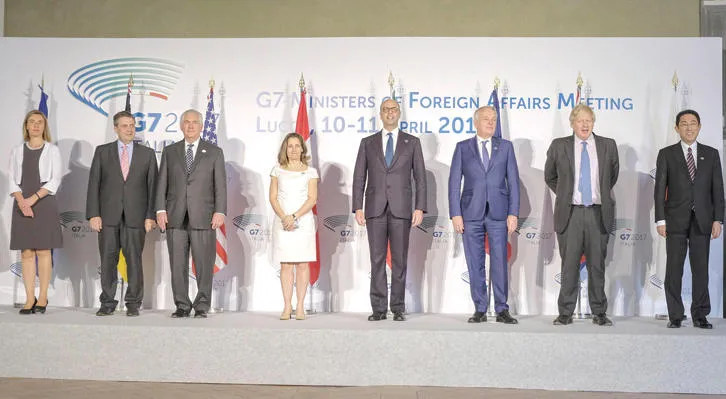 وزراء خارجية دول مجموعة السبع في ختام اجتماعهم أمس (أ.ب)