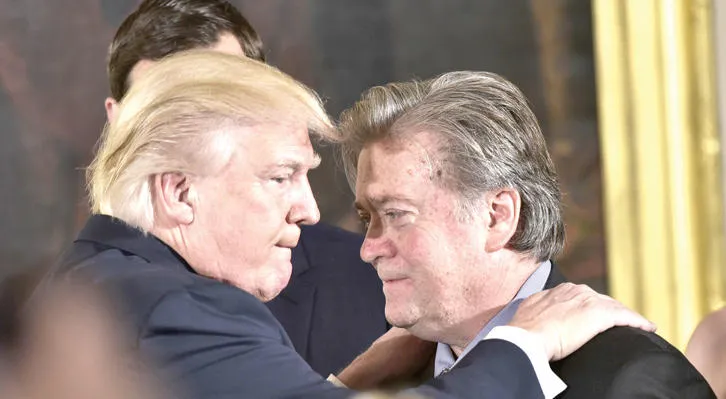 الرئيس الأميركي يهنئ بانون بعد أدائه القسم في البيت الأبيض في 22 يناير الماضي (أ.ف.ب)