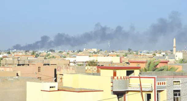أعمدة الدخان تتصاعد من موقع قصف جنوب الفلوجة أمس (أ.ف.ب)