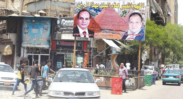 مصريون يمرون بالقرب من لوحة دعاية انتخابية للمرشح الرئاسي عبد الفتاح السيسي في أحد شوارع وسط القاهرة أمس (رويترز)