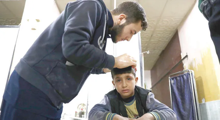 طفل سوري يبكي أثناء تضميد جراح في رأسه في مدينة دوما أمس (أ.ف.ب)