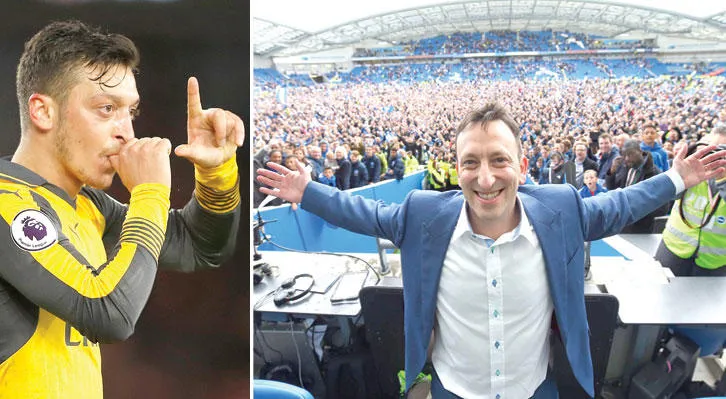 بلوم رئيس «برايتون» يشارك جماهير فريقه التي اقتحمت أرض الملعب للاحتفال بالصعود للدوري الممتاز (غيتي) - أوزيل يحتفل بهدفه الذي قاد آرسنال للفوز (رويترز)