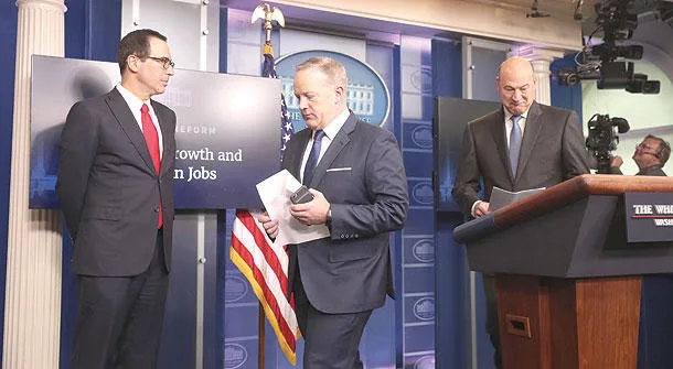 الناطق باسم البيت الأبيض شون سبايسر بين المستشار الاقتصادي غاري كوهين ومنوتشين في واشنطن أمس (أ.ب)