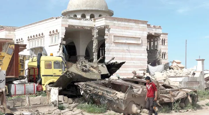 شاب مسلح يمر أمام «مسجد الفاروق» المدمر بفعل القصف في مدينة أعزاز بشمال سوريا أمس (أ.ف.ب)