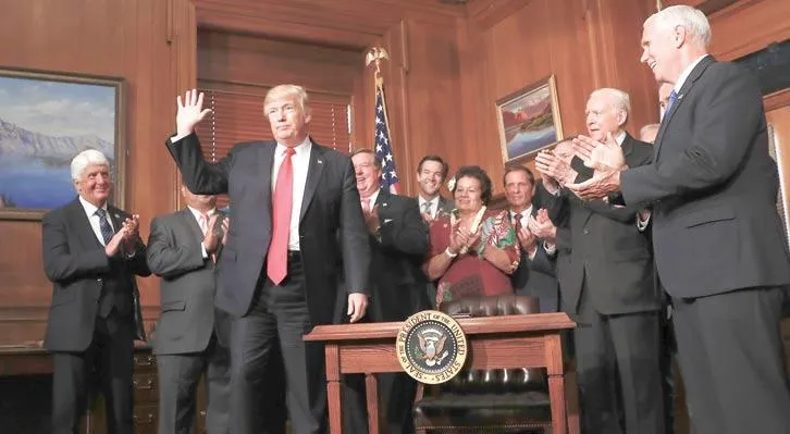 الرئيس الأميركي دونالد ترمب وفريقه بعد توقيعه أمراً تنفيذياً بوزارة الداخلية أمس (أ.ب)