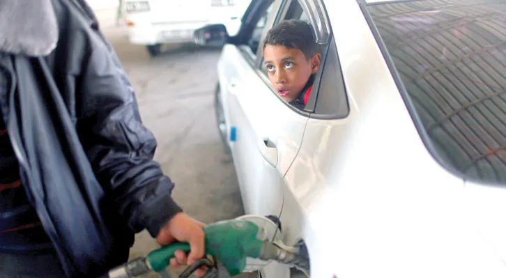 طفل فلسطين يتابع داخل سيارة عامل محطة بنزين يملأ خزانها (رويترز)