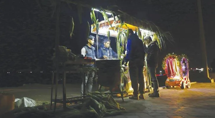 باعة في أحد شوارع غزة يستخدمون ضوء البطاريات لبيع الذرة في ظل انقطاع الكهرباء (أ.ف.ب)