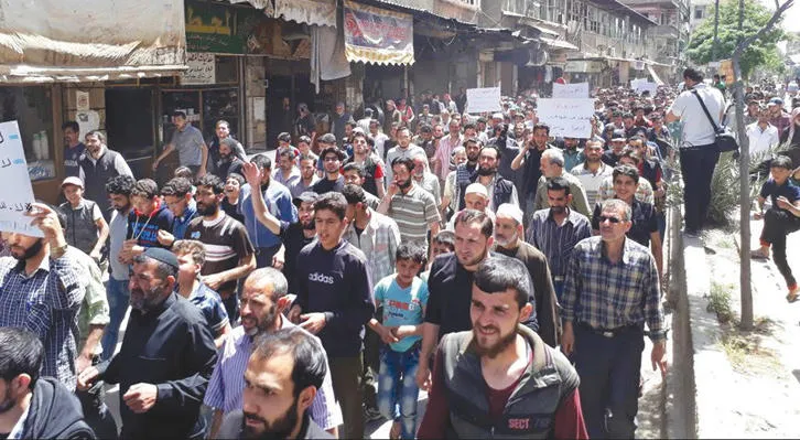 متظاهرون في غوطة دمشق الشرقية خرجوا أول من أمس احتجاجاً على القتال بين فصائل المعارضة في المنطقة (إ.ب)