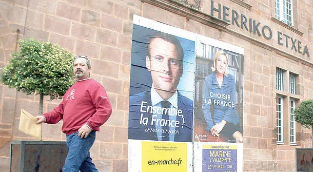 فرنسي يمر أمام ملصقين لمرشحي الرئاسة المتنافسين ماكرون ولوبان (أ.ب)