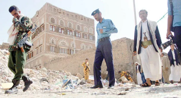 يتمركز تنظيم القاعدة في جزيرة العرب في اليمن، ويبدو في الصورة شرطيان ومواطنون عقب عملية تفجير يقف وراءها التنظيم في العاصمة صنعاء الأسبوع الماضي (أ.ف.ب)