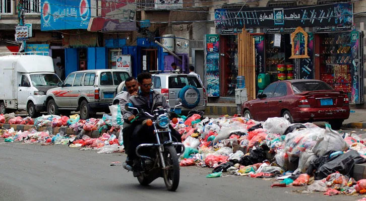 يمنيان على متن دراجة نارية قرب أكوام من القمامة في العاصمة صنعاء أمس (أ.ف.ب)