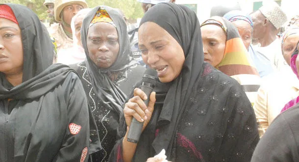 نانا شيتيما زوجة حاكم ولاية بورنو النيجيرية تبكي الاثنين الماضي أثناء حديثها داخل ثانوية شيبوك التي خطفت منها التلميذات (أ.ب)