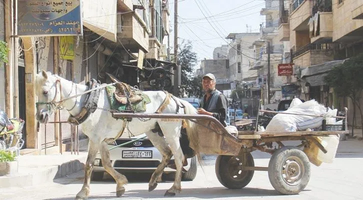 سوري مع حنطوره في أحد شوارع معرة النعمان شمال إدلب (أ.ف.ب)