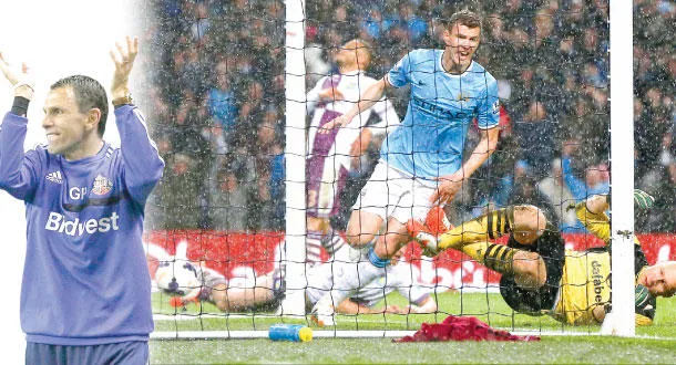 دزيكو مهاجم سيتي يحتفل بهدفيه في مرمى فيلا (رويترز)  -  بويت مدرب سندرلاند حقق المعجزة وأنقذ الفريق من الهبوط