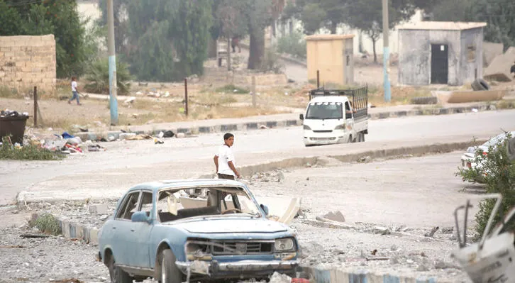 فتى سوري يمر قرب سيارة مدمرة في مدينة الطبقة التي سيطرت عليها أخيراً الميليشيات الكردية المدعومة من واشنطن (أ.ف.ب)
