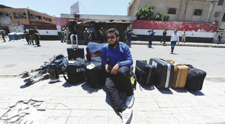 شاب من حي الوعر يتكئ على حقائب سفر لمقاتلين ومدنيين قبل تهجيرهم إلى ادلب أمس (رويترز)