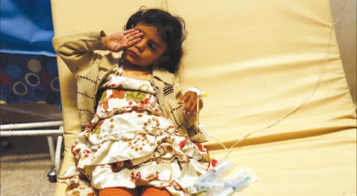 طفلة يمنية تنتظر الخدمات الطبية في مستشفى بصنعاء (إ.ب.أ)