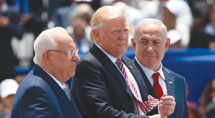 الرئيس ترمب بين الرئيس الإسرائيلي ريفلين (يسار) ورئيس الحكومة نتنياهو (أ.ب)