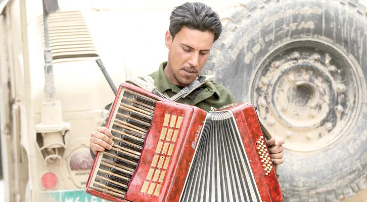 جندي عراقي يعزف الأكرديون خلال استراحة من المعارك في غرب الموصل أمس (أ.ف.ب)