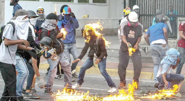 متظاهرون يستخدمون قنابل المولوتوف خلال اشتباكات مع قوات الأمن في كاراكاس أول من أمس (إ.ب.أ)