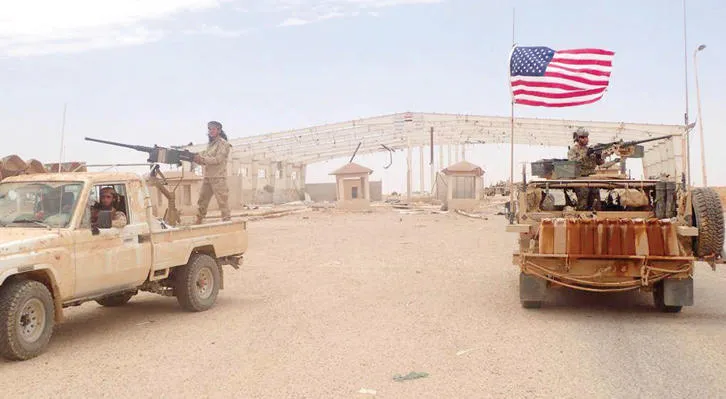 فصيل «مغاوير الثورة» المدعوم أميركياً على عربة مزودة بأسلحة ثقيلة بالقرب من عربة أميركية في معبر التنف الحدودي بين سوريا والعراق (أ.ب)