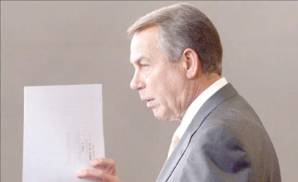 رئيس مجلس النواب (جمهوري من اوهايو) جون بوينر يرفع وثيقة خاصة بإنشاء خط انابيب في مؤتمر صحافي بواشنطن أمس (إ.ب.أ)