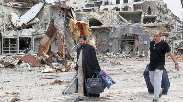 مدنيان سوريان يحملان أمتعتهما في حي الحميدية عقب الاتفاق بين المسلحين والقوات الموالية للنظام في مدينة حمص أمس (رويترز)