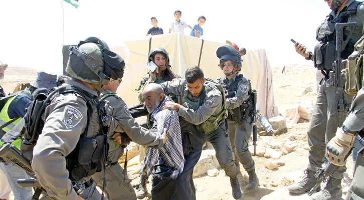 جنود إسرائيليون يعتقلون فلسطينياً في قرية سرورة جنوب أريحا أمس (إ. ب. أ)