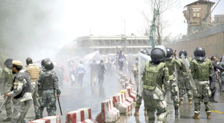 أطلقت الشرطة الأفغانية الرصاص الحي لتفريق مئات المتظاهرين الذين كانوا يحاولون التوجه إلى القصر الرئاسي خلال مواجهات كانت تطالب باستقالة الحكومة الأفغانية أمس (أ.ب)