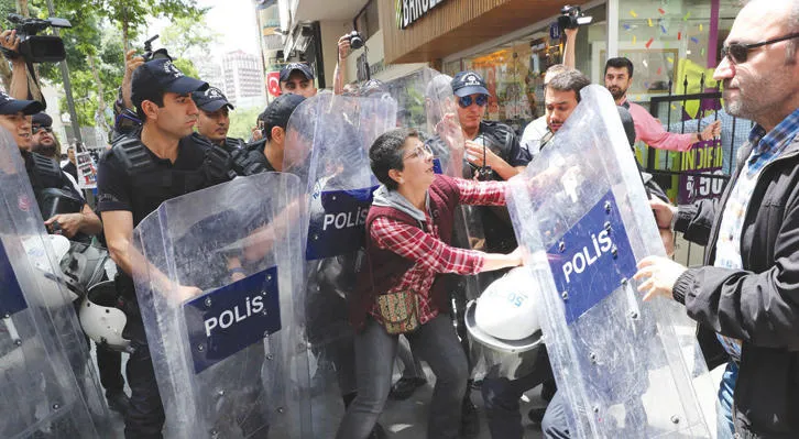 شرطة مكافحة الشغب تصد متظاهرين يحتجون على اعتقال ناشطين في أنقرة أول من أمس (أ.ف.ب)