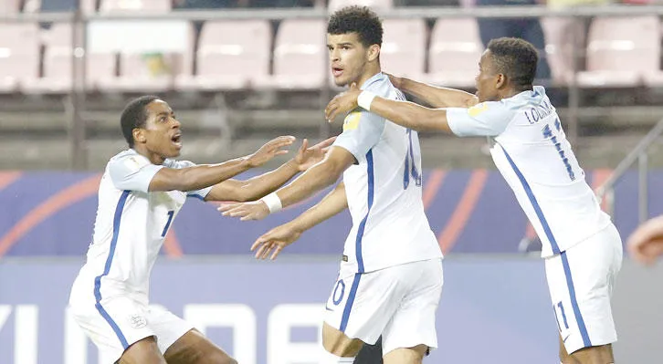 سولانكي (في الوسط) يتلقى التهاني بعد أن سجل هدفين لمنتخب إنجلترا (إ.ب.أ)