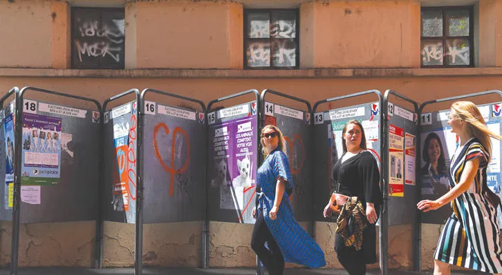امرأتان تمران أمام ملصقات انتخابية في باريس أمس (غيتي)
