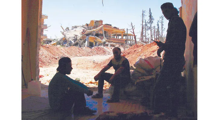 استراحة عناصر من «الجيش السوري الحر» أمس في حي المنشية بدرعا الذي يتعرض لقصف عنيف (رويترز)