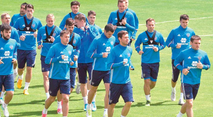 لاعبو المنتخب الروسي خلال التدريبات أمس استعداداً لمباراة نيوزيلندا (أ.ف.ب)