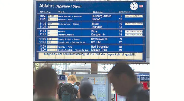 شاشة المعلومات في محطة قطار درسدن تظهر تأخيراَ في الرحلات بسبب الحريق قبل أيام (أ.ف.ب)