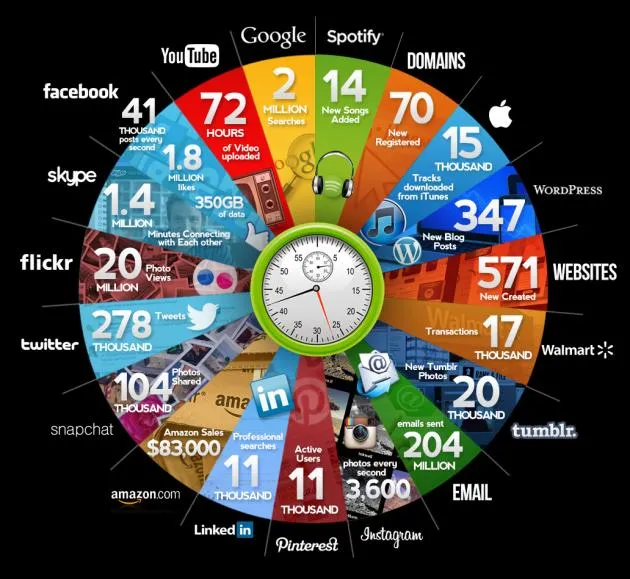 وإثر تزايد الاهتمام بالانترنت، تضاعفت المواقع والخدمات؛ وتقدر سعة ملفات وصفحات الشبكة بأكثر من 200 مليون قرص "دي في دي". وفي الآونة الأخيرة، يستبدل الناس وسائل التواصل التقليدية بمواقع التواصل الاجتماعي. ونشر موقع "اوبر فاكتس" إحصائيات تلخص ما يحدث من تواصلات وتفاعلات في الشبكة في كل 60 ثانية على مدار الساعة. وفي كل دقيقة، يحمل المستخدمون أكثر من 72 ساعة من الفيديو على موقع "يوتيوب"، و حوالي 4000 صورة على تطبيق "انستغرام"، وأكثر من 278 ألف تغريدة على موقع "تويتر"، ويحملون أكثر من 15 ألف أغنية عبر نظام "آي تيونز". أما موقع "فيسبوك"، فيستقبل أكثر من 41 مليون تعليق في الدقيقة من قبل مستخدميه حول العالم. ويتبضع الناس بقيمة تضاهي 80 ألف دولار أميركي من مواقع التبضع الالكترونية مثل "أمازون" كل 60 ثانية.
