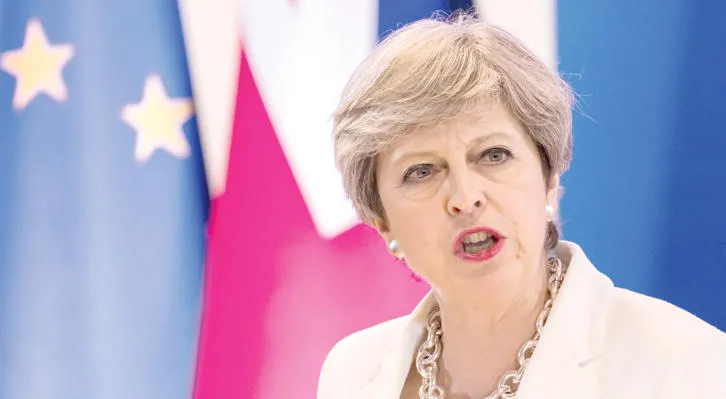 ماي خلال كلمتها أمام قمةمكافحة الإرهاب في بروكسل أمس (أ.ب)