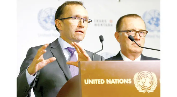 المبعوث الأممي الخاص إلى الجزيرة إسبن بارث إيدي (يسار) مع نائب الأمين العام للأمم المتحدة للشؤون السياسية جفري فيلتمان في مؤتمر قبرص في سويسرا (رويترز)