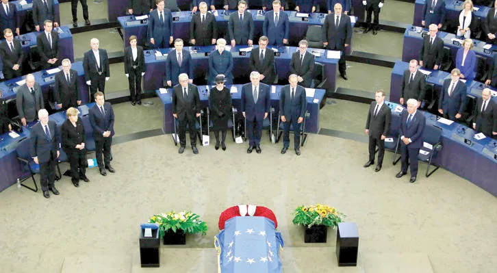 نعش المستشار الألماني كول ملفوفاً بعلم أوروبا داخل مبنى البرلمان في ستراسبورغ (إ.ب.أ)