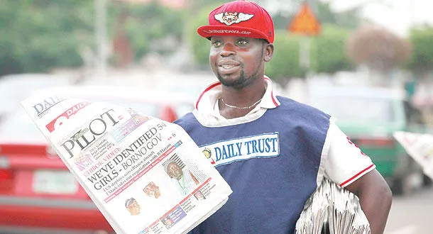 شاب يبيع في شارع بأبوجا أمس صحفا وضعت على صدر صفحاتها الأولى خبر التعرف على 54 من الفتيات المخطوفات بعد بث {بوكو حرام} شريط فيديو جديدا لهم الاثنين الماضي (أ.ب)