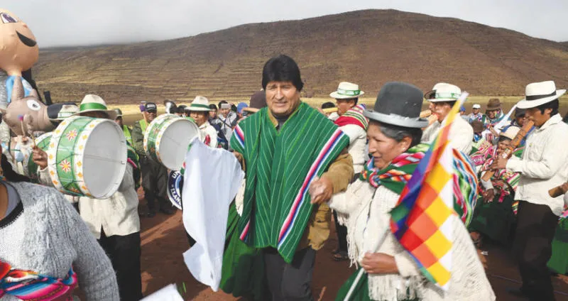 الرئيس البوليفي إيفو موراليس وسط عدد من السكان الأصليين  (رويترز)