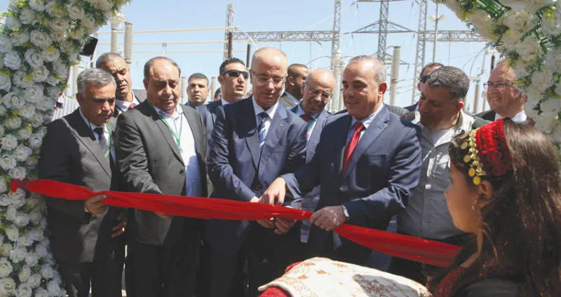 رئيس الوزراء الفلسطيني رامي الحمد الله (وسط) ووزير الطاقة الإسرائيلي يوفال شطاينتس (يمين) يدشان محطة كهرباء جديدة في الجلمة بالضفة الغربية (أ.ف.ب)
